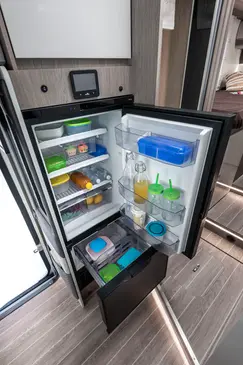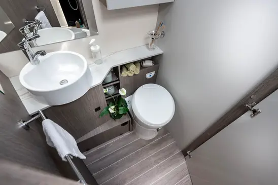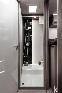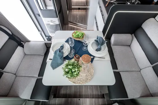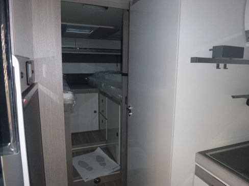 Das Bad bietet mit einer Kassettentoilette, Waschbecken und einer separaten Duschkabine alles, was man unterwegs braucht. Durch eine Tür können Sie Wohn- und Schlafbereich voneinander trennen und gönnen sich so den Luxus von 2 Zimmern. In der Küche mit großen Schubladen, Einschubkorb und „Softclose“ müssen Sie auch dank einer großen Kühl-Gefrier-Kombination mit Kompressorkühlschrank einer Spüle und einem Gasherd auf nichts verzichten. Die "Face to Face" Sitzgruppe mit beweglichem Tisch im vorderen Bereich des Wagens wird komplettiert durch die beiden schwenkbaren Vordersitze.