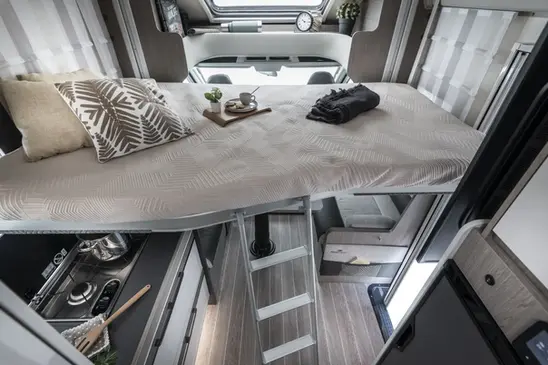 2 Personen können in den zwei Einzelbetten (bei Erweiterung der Einzelbetten auf die große Liegefläche sind 2 Erwachsene und ein bis zwei Kinder kein Problem), die mit großen Schubladen ausgestattet sind, unter einem Panoramadach im Heck schlafen. Ein weiteres elektrisches Hubbett für 2 Personen mit einer Liegefläche 130cmx200cm und belastbar bis 250kg finden Sie im Dach über dem Wohnbereich.