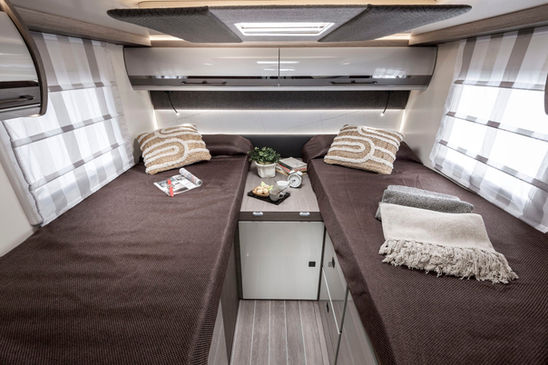 Rollerteam Zefiro 287 TL – Luxuriöser Teilintegrierter mit "All Inclusive Ausstattung" und zwei Einzelbetten im Heck mit einer Liegefläche von je 80cm X 200cm, das problemlos auf ein großes Bett mit einer Liegefläche 210cm x 200cm umfunktioniert werden kann.